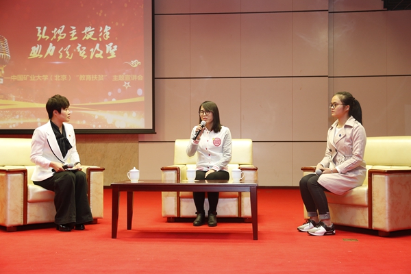 教育扶贫的初心就是要保证贫困家庭孩子受到教育,为斩断贫困的代际传递夯实根基。在现场,主持人还分别对我校第一届国家专项计划录取的都安籍学生、现为研一的邓丽梅同学和我校教师“一对一”资助的都安籍学生、现就读于中央民族大学的大一学生蒙婷进行了访谈。两名同学从各自的亲身经历讲述了通过教育扶贫朝着自己梦想努力的故事,希望自己在得到默默奉献爱心和善意的老师们的帮助下,能够成为善行的下一个传承人,更是希望通过自己的努力可以改变家乡贫困群众的观念,使更多的贫困学子走出大山,受到良好的教育。
