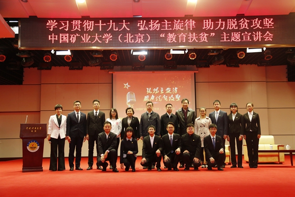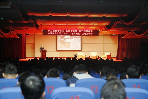 本网讯 为深入学习宣传贯彻党的十九大精神,落实十九大报告提出的“确保到二〇二〇年我国现行标准下农村贫困人口实现脱贫,贫困县全部摘帽,解决区域性整体贫困,做到脱真贫、真脱贫”要求,11月9日下午,学校举行“学习贯彻十九大,弘扬主旋律,助力脱贫攻坚”教育扶贫主题宣讲会。校党委副书记王忠强,校党委副书记、纪委书记董晞,副校长王家臣,原副校长范迅及学校800余名师生代表聆听了宣讲会。
