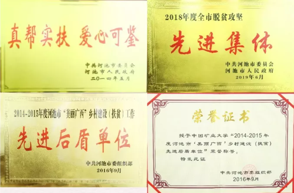 学校扶贫干部的优秀成绩获得当地部门高度认可,先后荣获“2014-2015年度河池市‘美丽广西’乡村建设(扶贫)先进后盾单位”、“2016-2017年度河池市脱贫攻坚定点帮扶工作先进单位”、“2018年度河池市脱贫攻坚先进集体“等称号、我校团委被授予“2019年度河池市脱贫攻坚先进集体”。