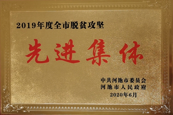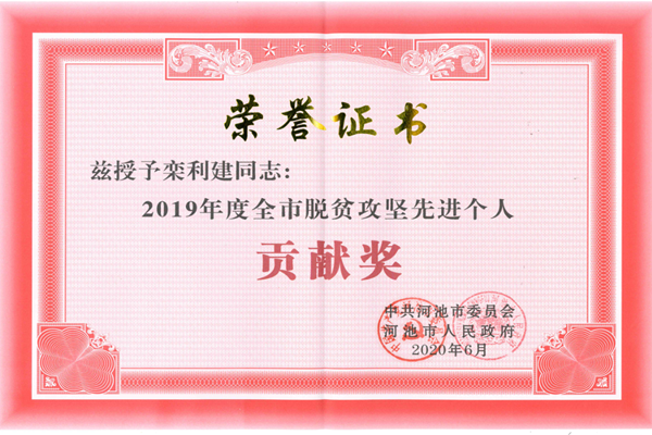本网讯 2020年6月17日,广西壮族自治区河池市召开会议,对2019年度脱贫摘帽县、脱贫摘帽村、脱贫攻坚先进集体和先进个人进行表彰。共青团中国矿业大学(北京)委员会被授予“2019年度河池市脱贫攻坚先进集体”,我校派驻琴棋村党组织第一书记栾利建同志被授予“2019年度河池市脱贫攻坚先进个人贡献奖”。
