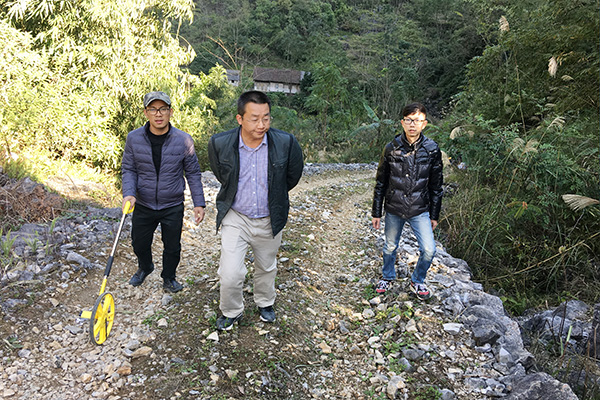 2017年12月20日,谢均岩会同施工方对由中国矿业大学(北京)援资硬化的琴棋村沙岩屯屯级路进行测量