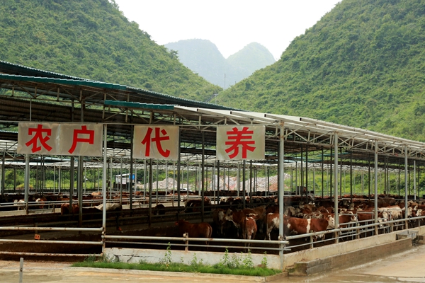 都安县除了在教育、医疗、水电路等基础设施建设和招商引资上下大力气之外,还把注意力放在了产业发展上。“贷牛还牛”是都安的主打产业项目,通过小额扶贫贷款资金扶持贫困户养牛,贫困户免费从养殖龙头企业“贷牛”,可自养也可由合作社代养,牛养大后企业按高于市场价回购,不仅促进了脱贫攻坚,还加快了产业结构调整。政府为农户购买保险,养殖风险由保险公司承担。这个养殖模式也被广西选为典型范例上报给中央。
