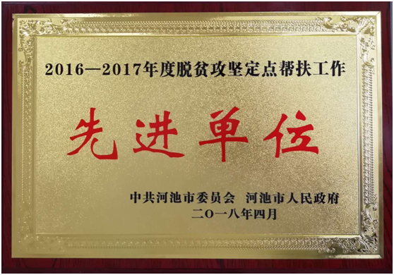 本网讯 近日,我校荣获河池市“2016-2017年度脱贫攻坚定点帮扶工作先进单位”称号。