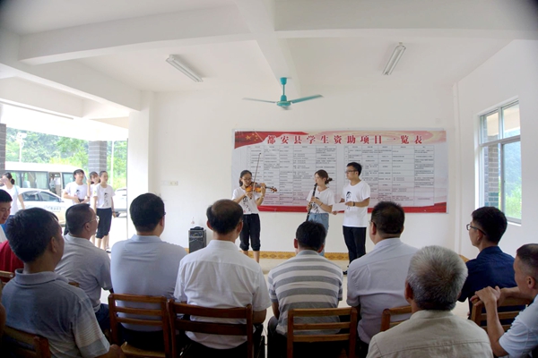 实践团在琴棋村综合文化服务中心为村民表演文艺节目,并与当地干部群众联欢。实践团表演了舞蹈《水之灵》《芳华》、乐器合奏《九儿》《梁祝》、小提琴独奏《新疆之春》、单簧管独奏《苏北调变奏曲》、民俗小曲《点四香》《探清水河》等节目,精湛的技艺博得村民阵阵掌声,当地干部群众受邀上台一起表演节目,为村民带来了难得的文娱活动。