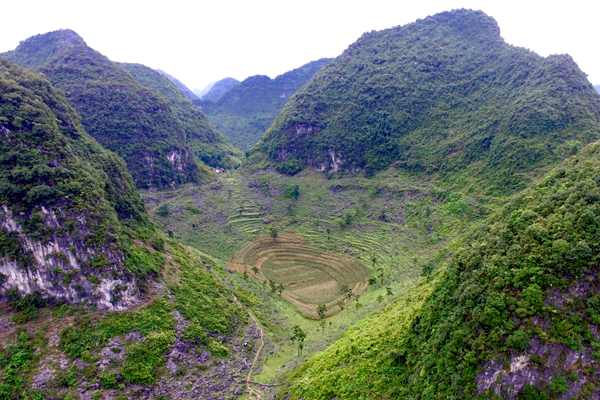 都安美丽却不富饶。都安的一二三产业均不发达。除了一个水泥厂,全县没有几家像样的工业企业;都安有个别名——“石山王国”。九分石头一分土,土地极其匮乏,人均耕地不足0.7亩,且石漠化严重。还有很多望天田(在漏斗形山谷谷底,雨季到来会形成水泡地,水泡之前如果庄稼还没成熟,就基本绝收)和筑坝围田的小块土地,适合机械化耕种的少之又少。