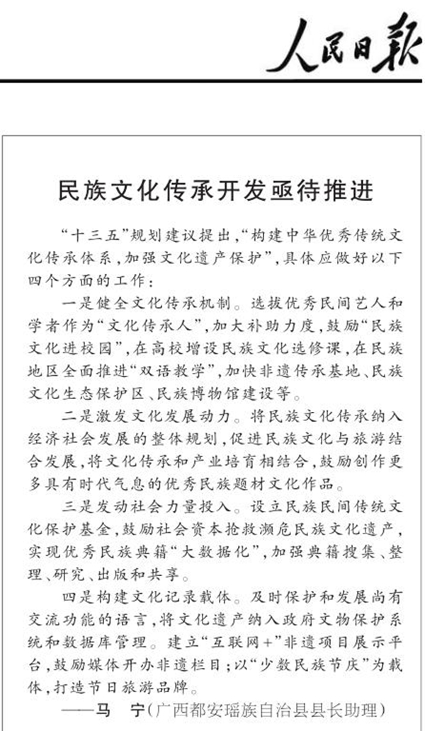 挂职期间,马宁在都安瑶族自治县党委年终考核中被评为“优秀干部”,工作中的所思所想也凝结成文字,在《人民日报》“问计献策十三五”栏目刊登,并得到自治区党委宣传部的嘉奖。