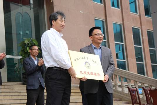 副校长王家臣向都安高中授予“优质生源基地”牌匾,教务处处长、招生办公室主任刘波与都安高中校长蓝志标共同签署合作协议书。