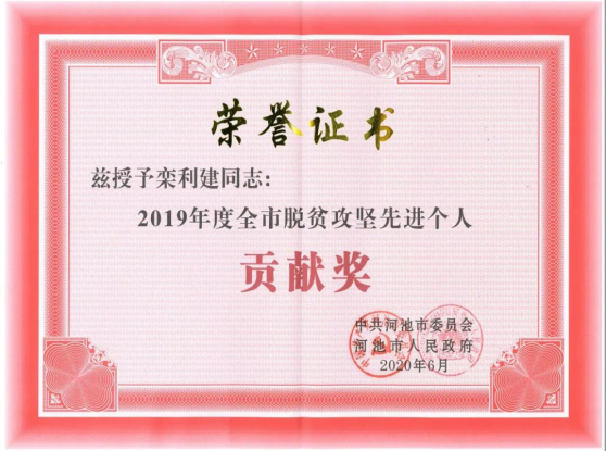 2020年6月,河池市授予栾利建2019年度